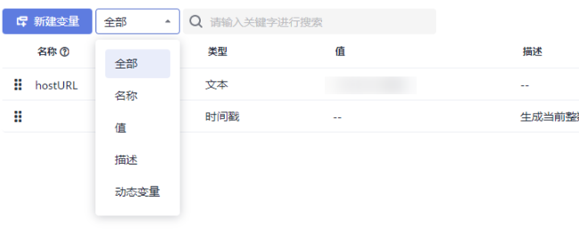 - 变量参数选择:全部、名称、值、描述、动态变量。