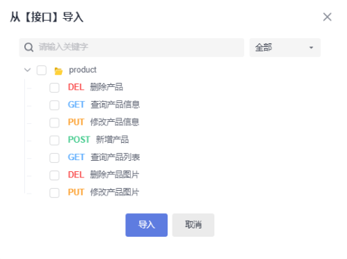 - 在弹出的“从【接口】导入”对话框上,选择需要导入的接口,即“API设计”的接口数据。
