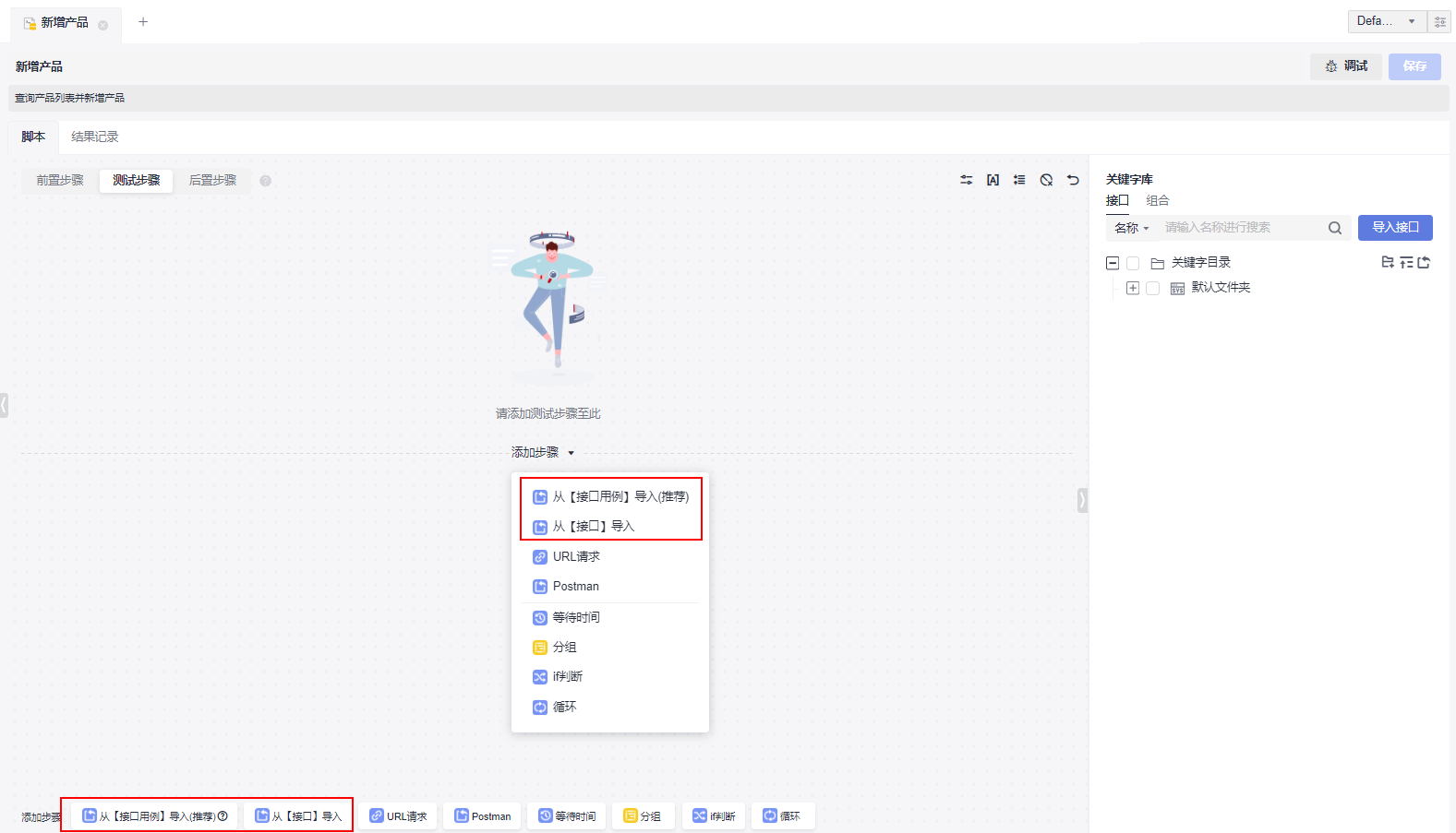 用户可以将API设计的数据导入测试步骤,主要有两个来源:“从【接口用例】导入(推荐)”和“从【接口】导入”。