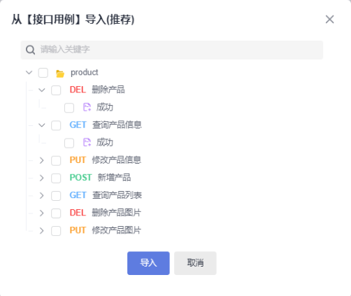 - 在弹出的“从【接口用例】导入(推荐)”对话框上,选择需要导入的接口,即“API设计”中接口的调试用例,参考保存为用例。