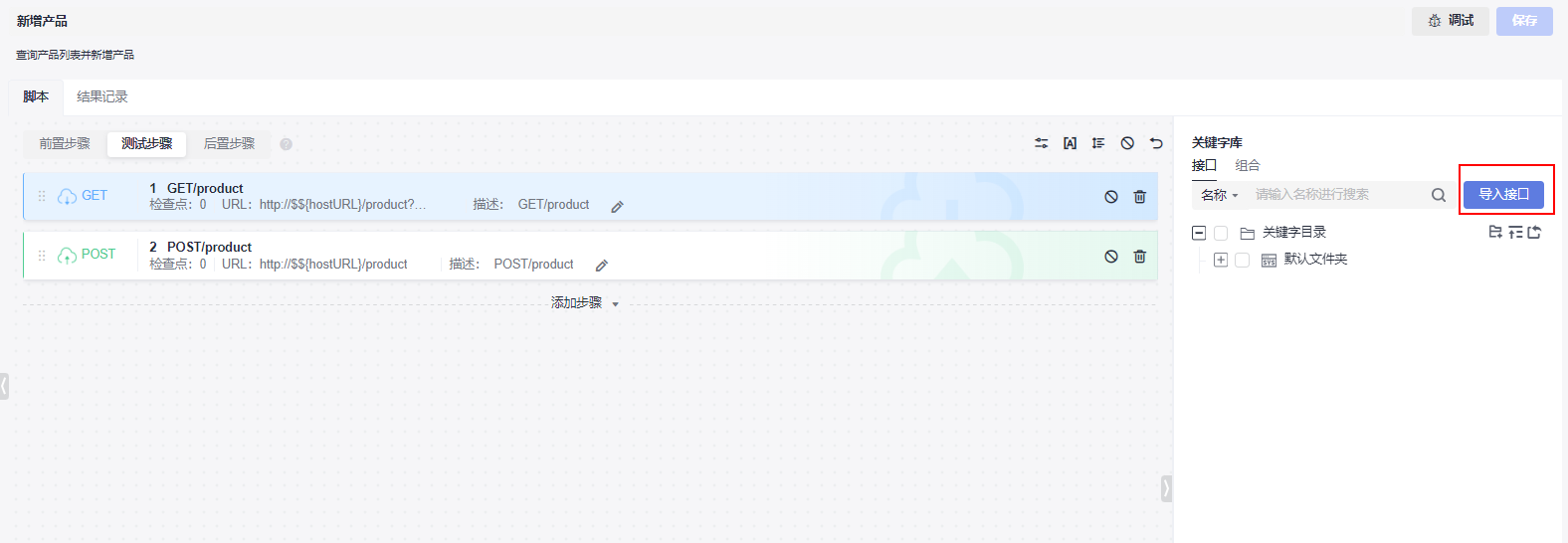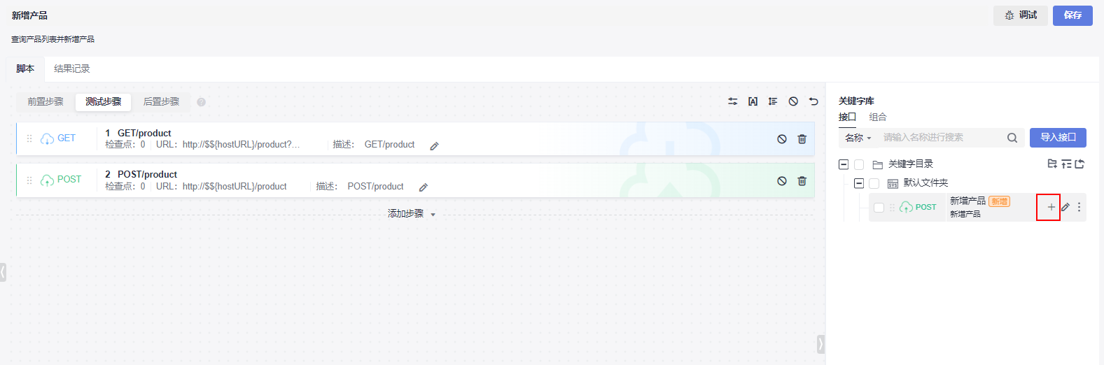 - 文档导入成功后,系统自动解析生成脚本模板,脚本模板包含了接口的基本描述信息。可以从“关键字库”界面单击“+”或直接拖拽接口添加至测试步骤,只需要按模板输入接口参数就可以进行测试。