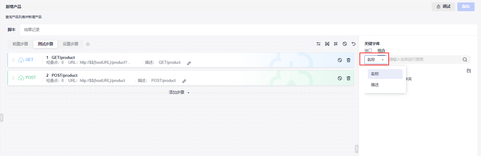 - 单击关键字库中“名称”下拉列表,可以按照“名称”、“描述”,搜索对应的关键字。