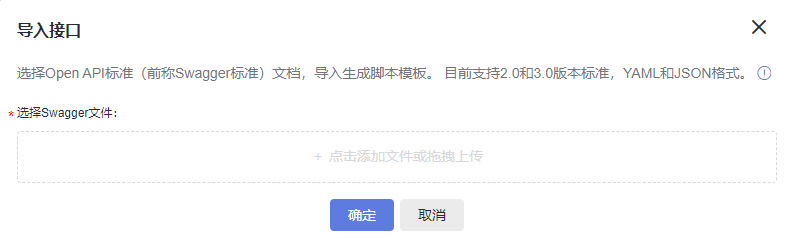 - 在弹出的“导入接口”页面,单击“点击添加文件或拖拽上传”,选择配置好的Swagger接口文档,单击“确定”,完成Swagger文件导入。