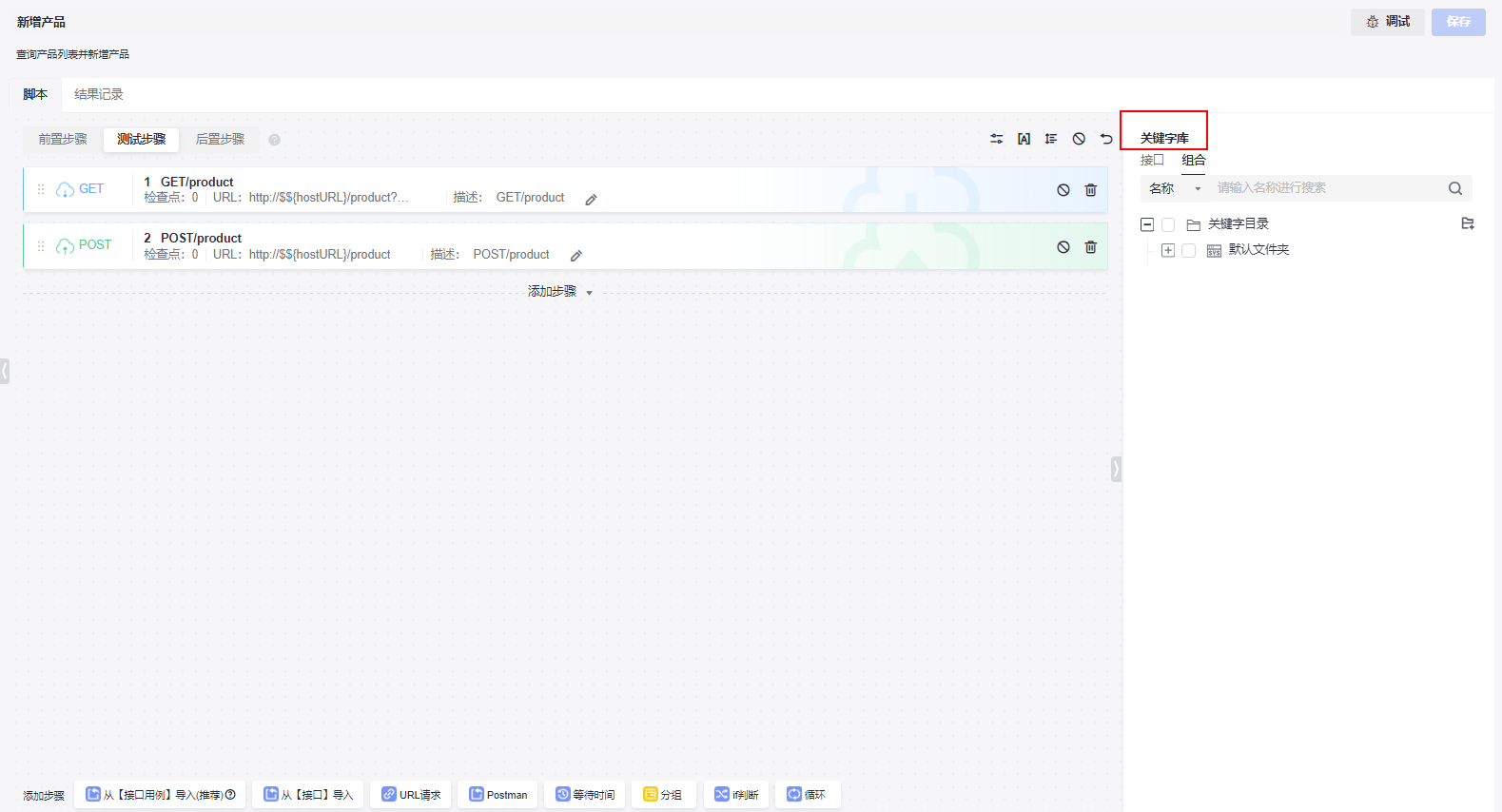- 在“脚本”页签,页面右侧展示“关键字库”。