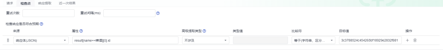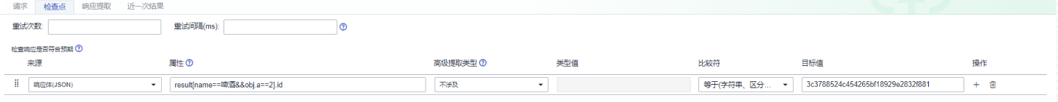 检查体的“属性”字段,可输入下标为“key:value”格式的数组,用以实现根据给定的“key:value”从响应体中获取满足该条件的json串。
