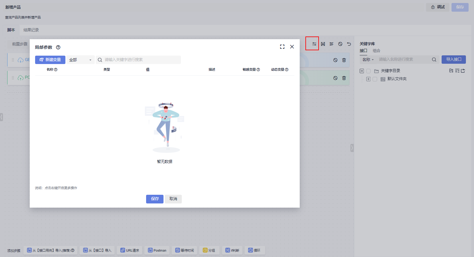 局部参数使用范围是当前测试用例,如:测试步骤的参数、检查点、变量等都可以引用局部参数。