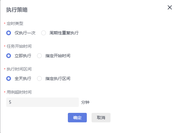 - 用例超时时间:设置每个用例的最长执行时间,超过时间,用例则超时失败。 任务继续执行,直到最后一个用例执行完毕。可设置分钟级,小时级,天级。