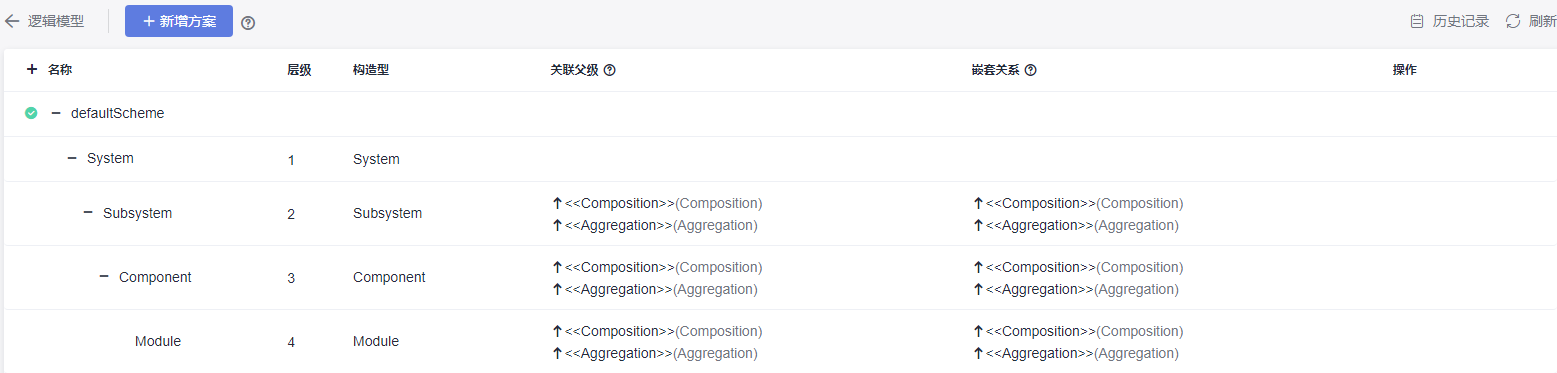 在逻辑模型中创建逻辑元素,逻辑元素在架构树中与上下级元素的关系层级结构要与逻辑模型架构方案配置定义的层次结构一致,即该逻辑元素与上层父级元素、下层子级元素的父子关系(也称上下层级关系)、以及它们之间的连线关系和方向指向,都要与层级规则中定义的保持一致。
