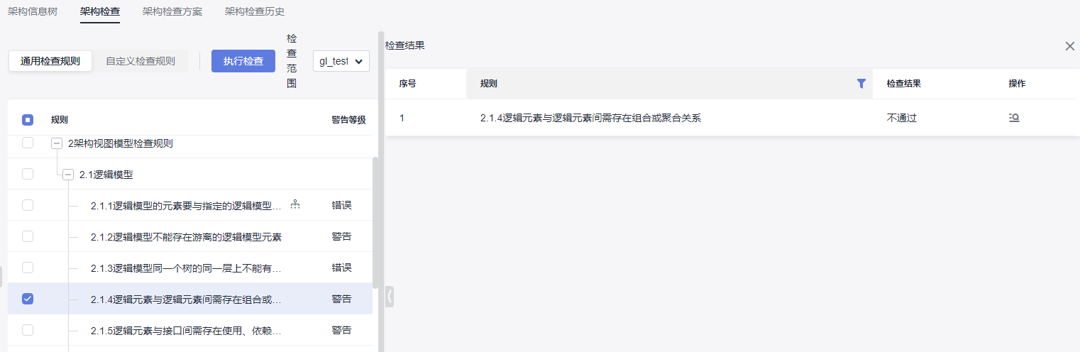 该规则项检查出的是架构信息树中按模型图构树后显示红色叹号的告警元素。