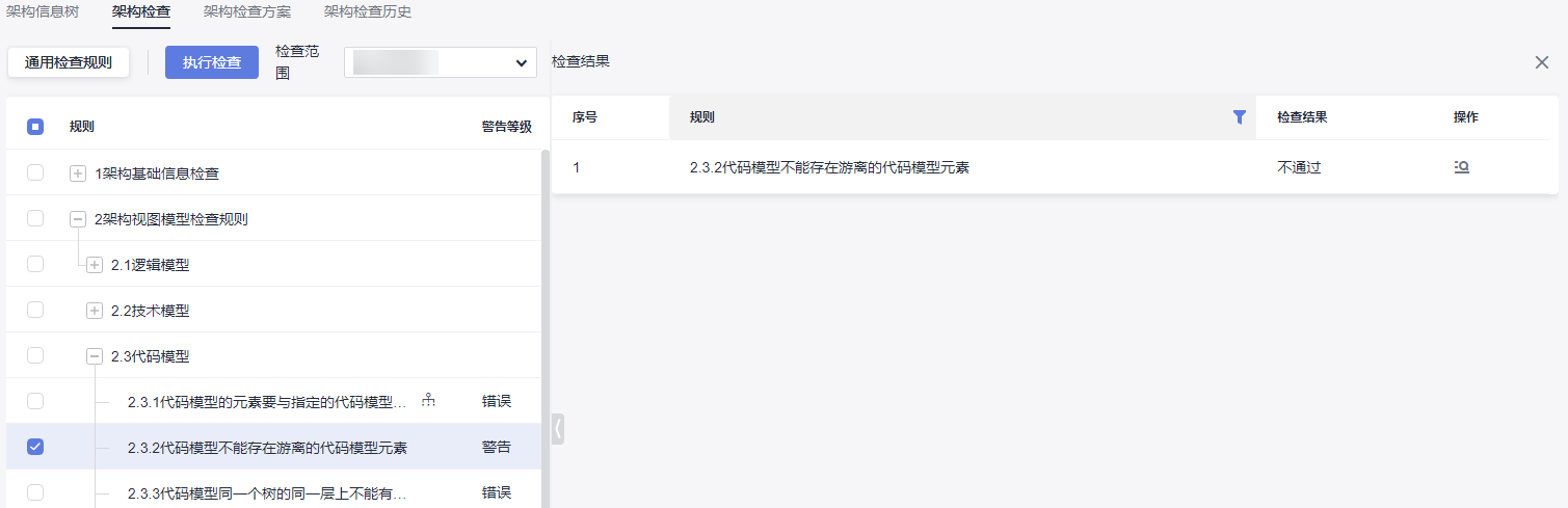 检查规则支持配置元素,勾选要检查的元素(默认勾选服务、微服务、组件、模块),检查元素在代码模型图中是否与代码元素存在manifest连线关系,由代码元素指向逻辑元素,不存在对应的代码元素则不符合规则 ,将该类逻辑元素列出到检查结果中。