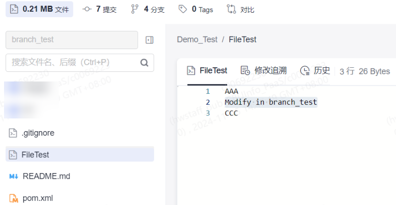 - 切换到“branch_test”分支,修改“FileTest”内容如下图所示。将提交信息填写为“Update FileTest in branch_test”。此时“master”分支与“branch_test”分支的内容已产生差异,即代码冲突。