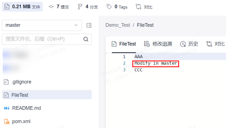 - 在“master”分支中,将“FileTest”的内容修改为如下图所示,将提交信息填写为“Update FileTest in master”。