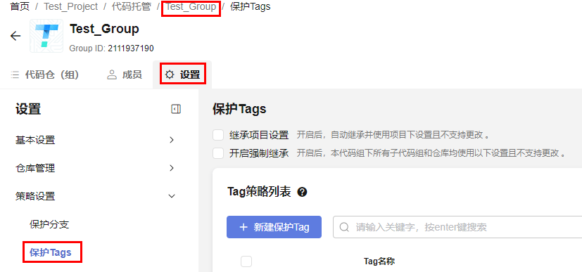 用户可为代码组下的所有仓库配置“保护Tags”规则,配置前请查看约束与限制,参考配置代码组的保护Tags。