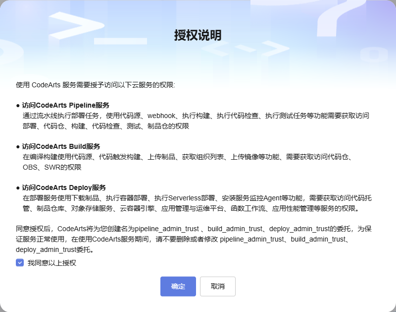 - 如果在登录CodeArts时遇到以下弹窗,并勾选“我同意以上授权”,则CodeArts将自动创建委托,并默认添加委托到项目中。此时可无需再次创建委托。