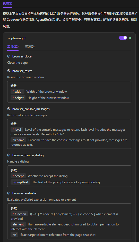 例如,您想通过Playwright直接操控浏览器完成网页导航、点击、输入、截图、数据提取等自动化操作。mcp_settings.json文件配置如下:{ "mcpServers": { "playwright": { "command": "npx", "args": [ "@playwright/mcp@latest" ] } } }此示例用户需要本地安装node.js环境,推荐node-v24.x版本。您也可以通过与智能体交互,让智能体为您直接安装。