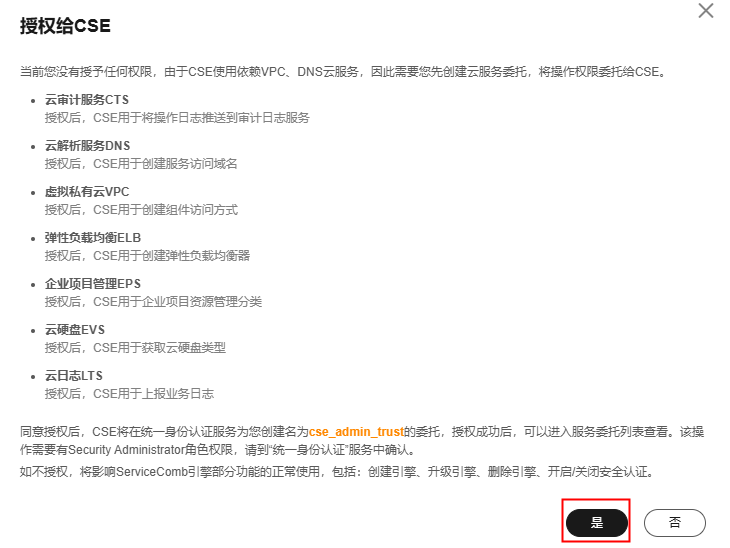 当您没有授予任何权限时,由于CSE的使用依赖VPC、DNS等云服务,因此需要先创建云服务委托,将操作权限委托给CSE,即在“授权给CSE”弹出框中单击“确定”。CSE将在统一身份认证服务为您创建名为cse_admin_trust的委托,授权成功后,可以进入服务委托列表查看。该操作需要有Security Administrator角色权限。如不授权,将影响微服务引擎部分功能的正常使用,包括:创建引擎、升级引擎、开启/关闭安全认证。