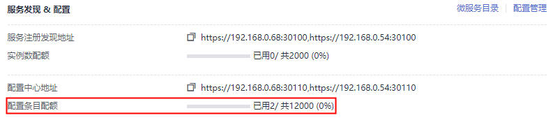 - 在“服务发现 & 配置”区域,查看引擎的配置条目配额及配额使用情况。