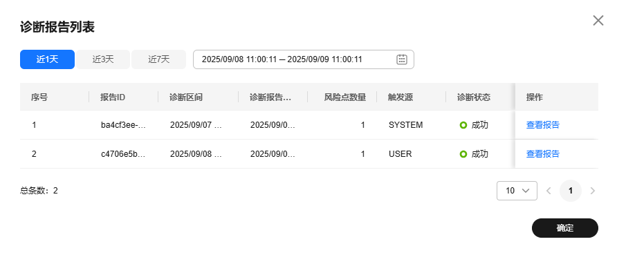- 单击“查看历史诊断报告”,查看历史诊断报告。