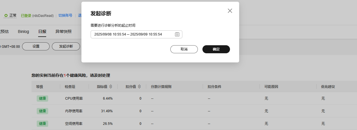 - 单击“发起诊断”,对当前实例进行诊断操作。待诊断完成后,在“安全评分”区域,查看安全评分的结果,可以查看具体扣分的项目和所扣分数。数据管理服务支持的评分规则请参见评分规则表。