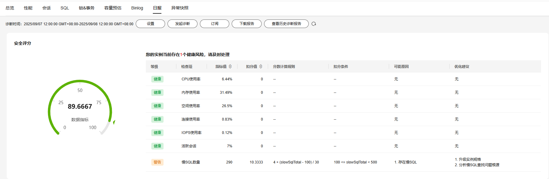 对前一日实例状态的汇总展示,包括性能&磁盘分析、SQL分析、库表分析和事务分析。支持用户下载和订阅分析报告。建议每天定时对实例进行诊断,以保证实例上业务的正常运行。