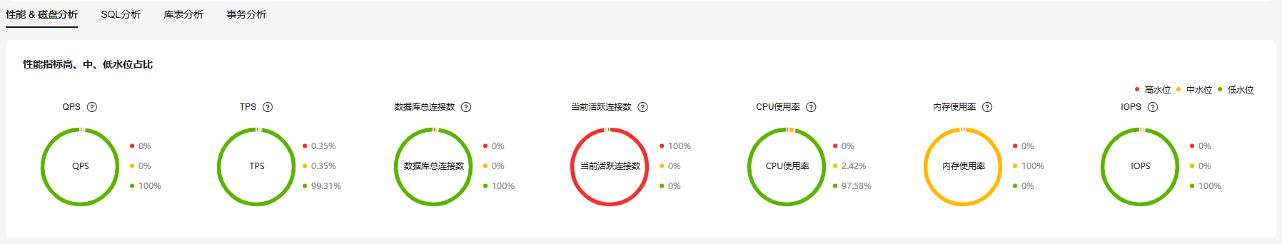 在“性能&磁盘分析”区域,可查看性能指标中、高、低水位的占比以及性能指标趋势图。