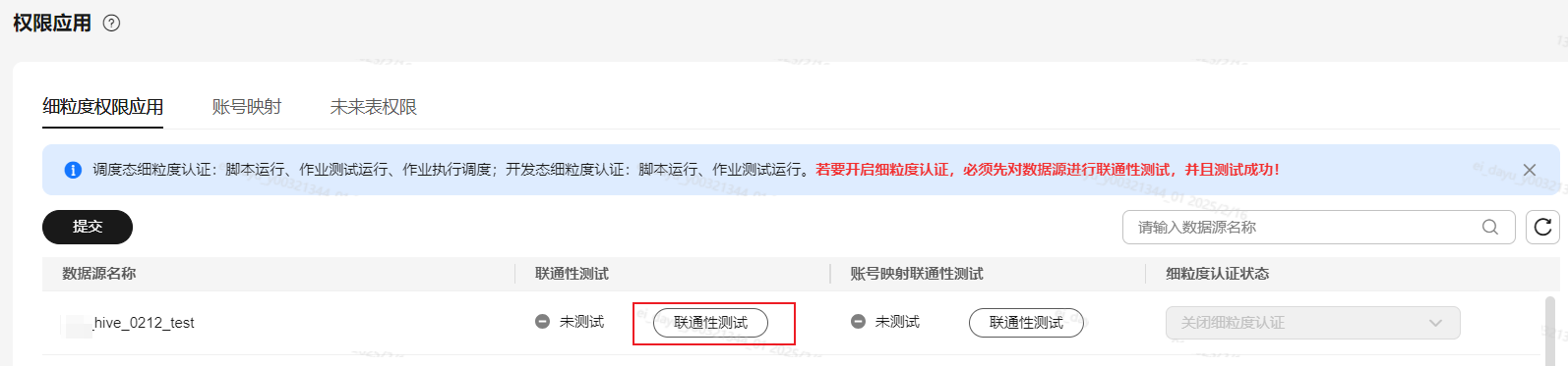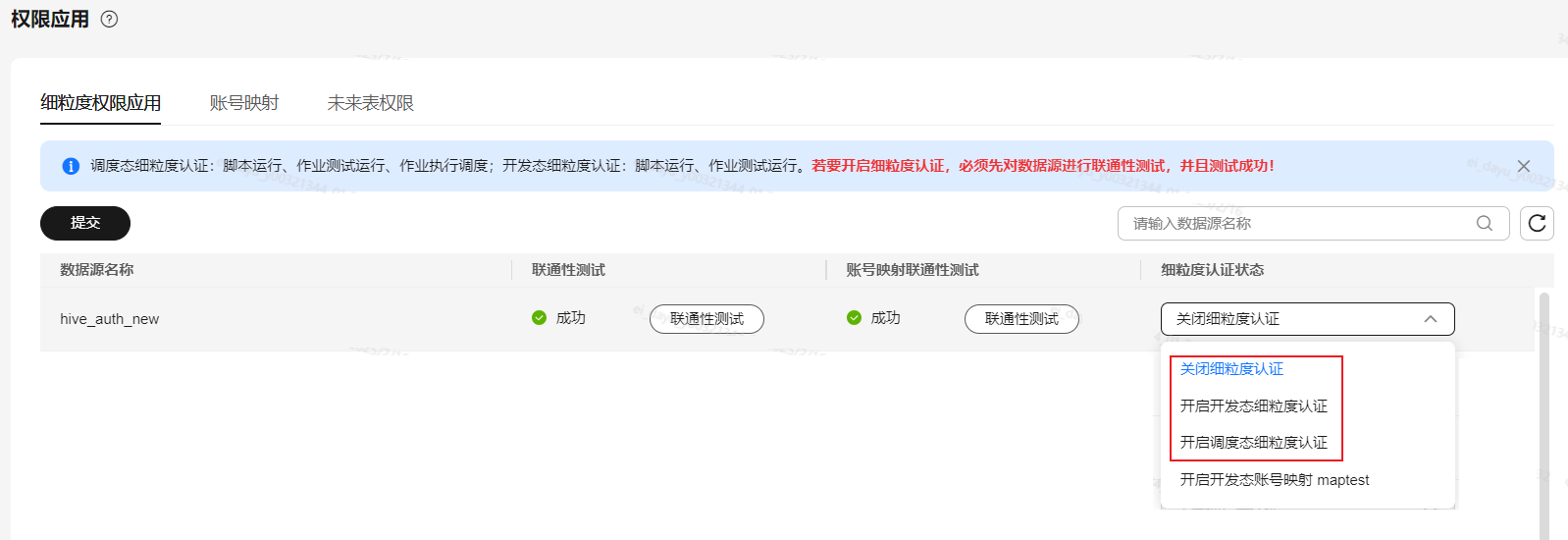 - 联通性测试成功后,在细粒度认证状态列,根据所需选择启用开发态或调度态的细粒度认证,然后单击下方的“提交”,即可开启细粒度认证。