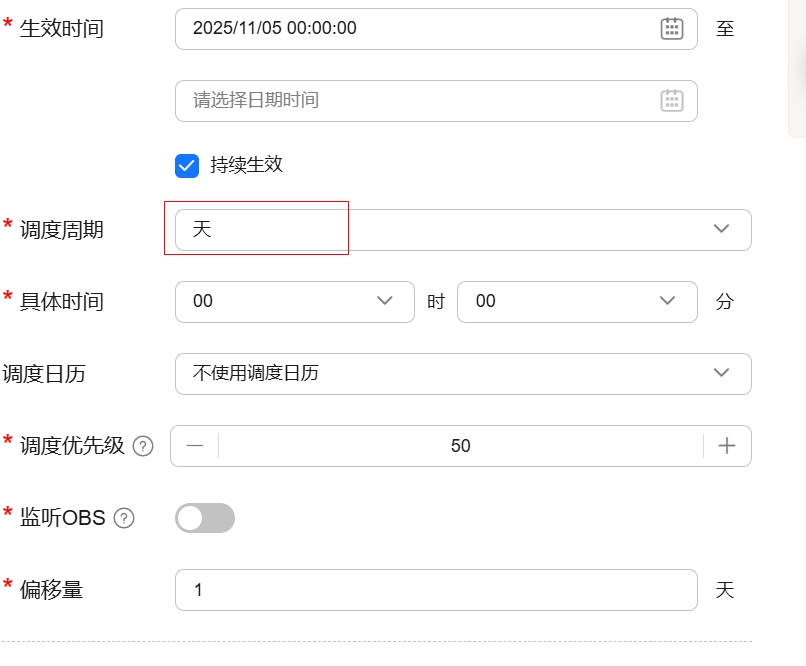 将任务配置调度周期为【天】,任务将按天调度并抽取一天内的OBS消息。