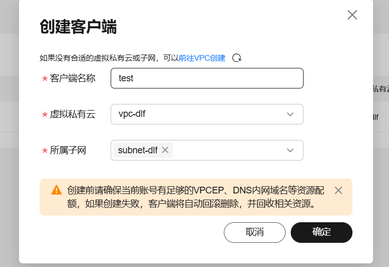 如果缺少DNS或VPCEP,则需要删除对应Fabric/Lakeformation接入管理客户端,扩大配额后,重新创建Fabric/Lakeformation接入管理客户端。