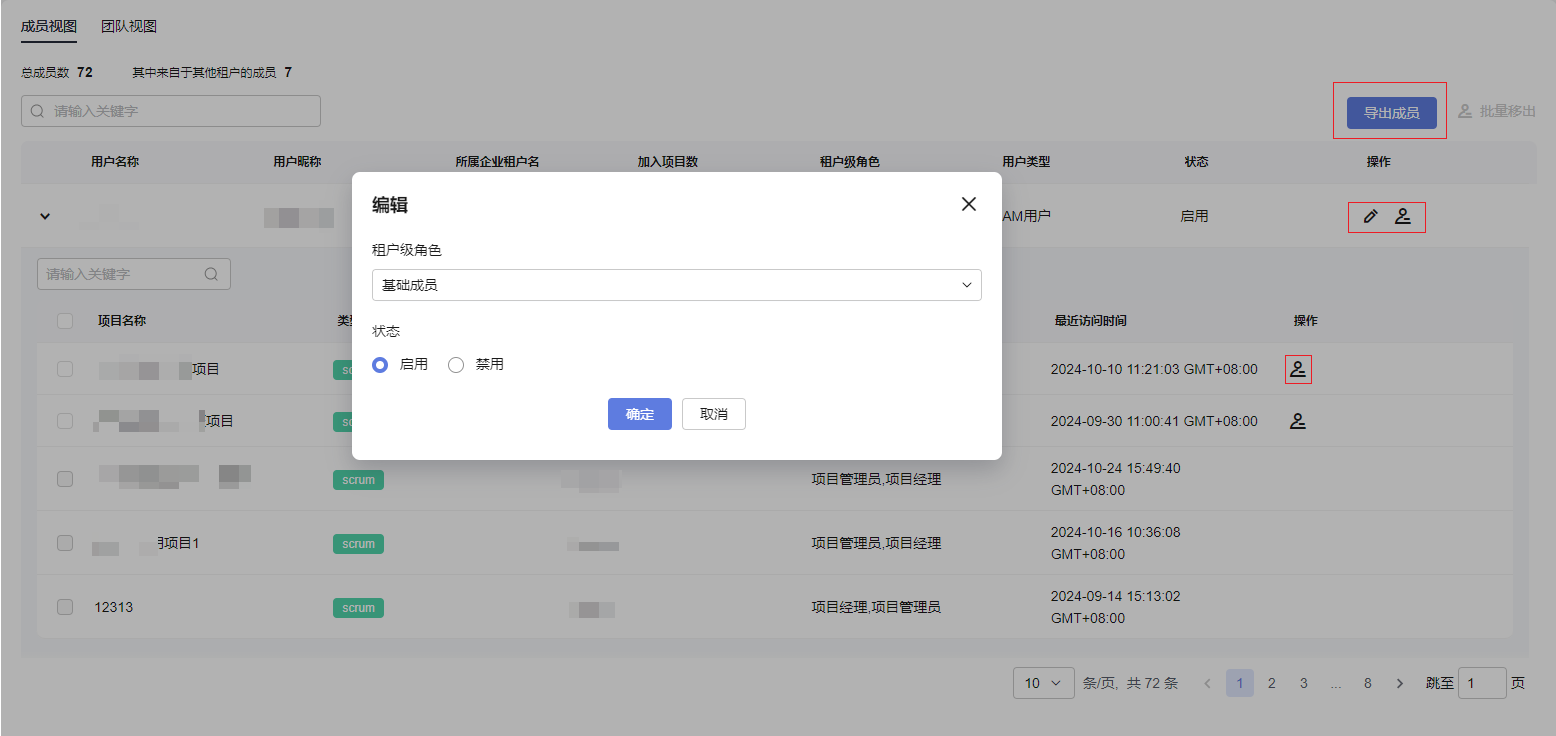 - 将成员从所有项目中移出:在列表中找到目标成员,单击“操作”列中
