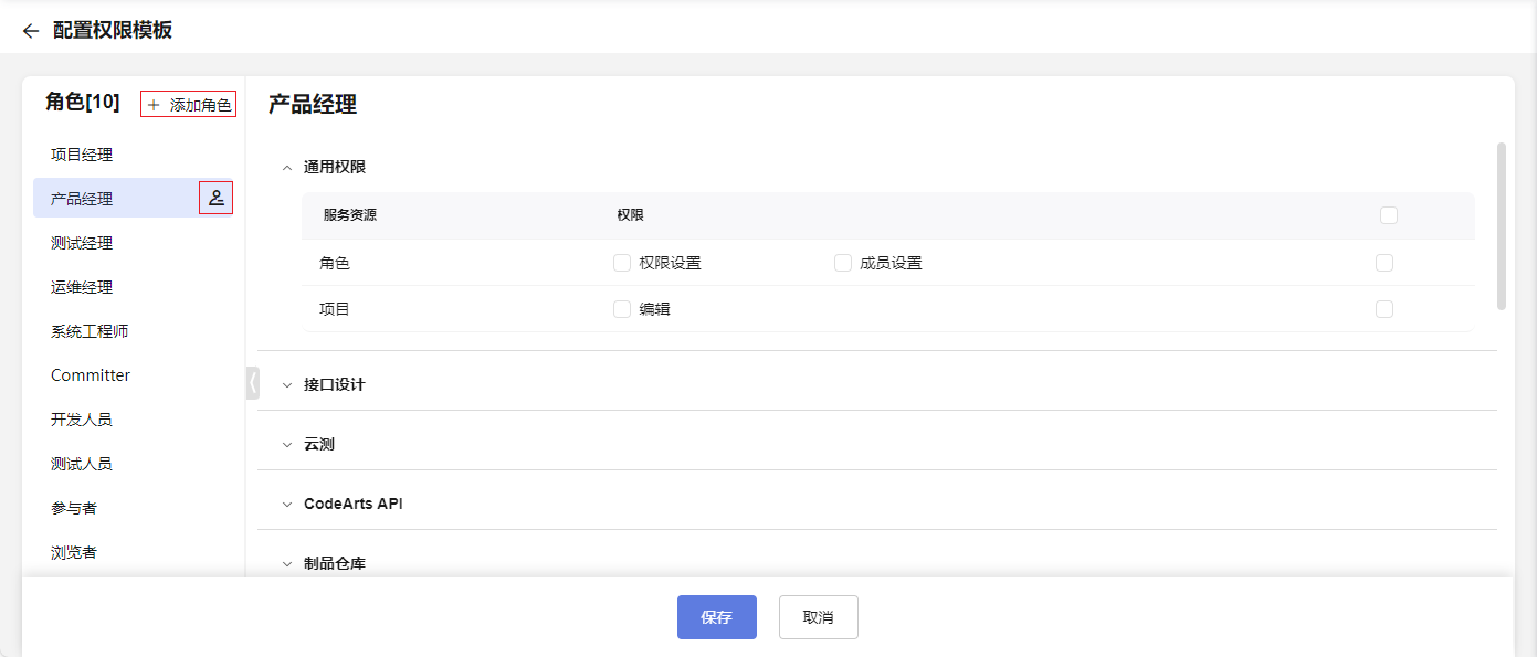 在配置权限模板时,如果CodeArts内置的系统角色不满足使用需求,用户可以自定义角色并配置操作权限。