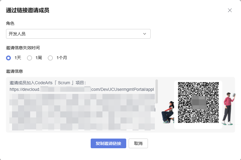 CodeArts项目中的成员可以分享项目二维码或者链接给其他用户。收到邀请的用户通过二维码或链接提交加入项目申请,待项目管理员审批后,该用户即可成为项目成员。