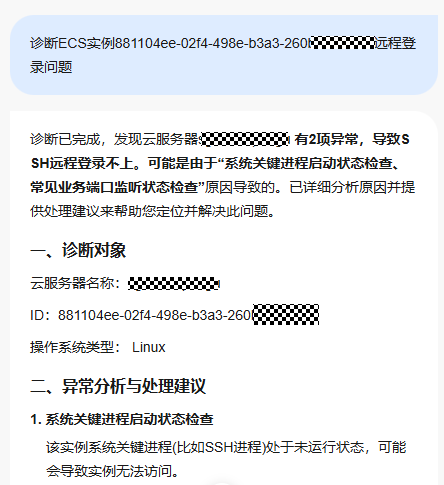 当出现因网络配置错误、系统配置错误导致的SSH无法成功登录的问题时,用户可以通过盘古Doer的诊断ECS能力进行故障快速定位,并根据提供的解决方案快速解决问题。