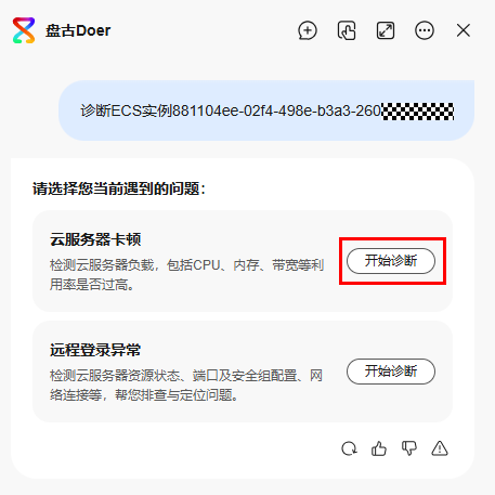 - 选择问题:在弹出的盘古Doer对话框中,选择“云服务器卡顿”,单击“开始诊断”。