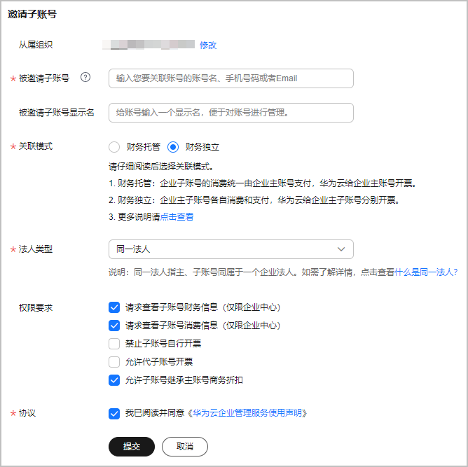 企业主账号(即开通了企业中心功能的客户)可以在“邀请子账号”页面通过选择财务托管模式或者财务独立模式邀请关联企业子账号。