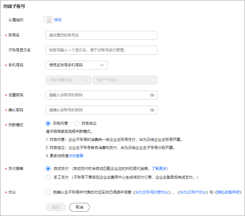 - 设置子账号的基本信息,如账号名、手机号码,登录密码、关联模式等,勾选相关协议。