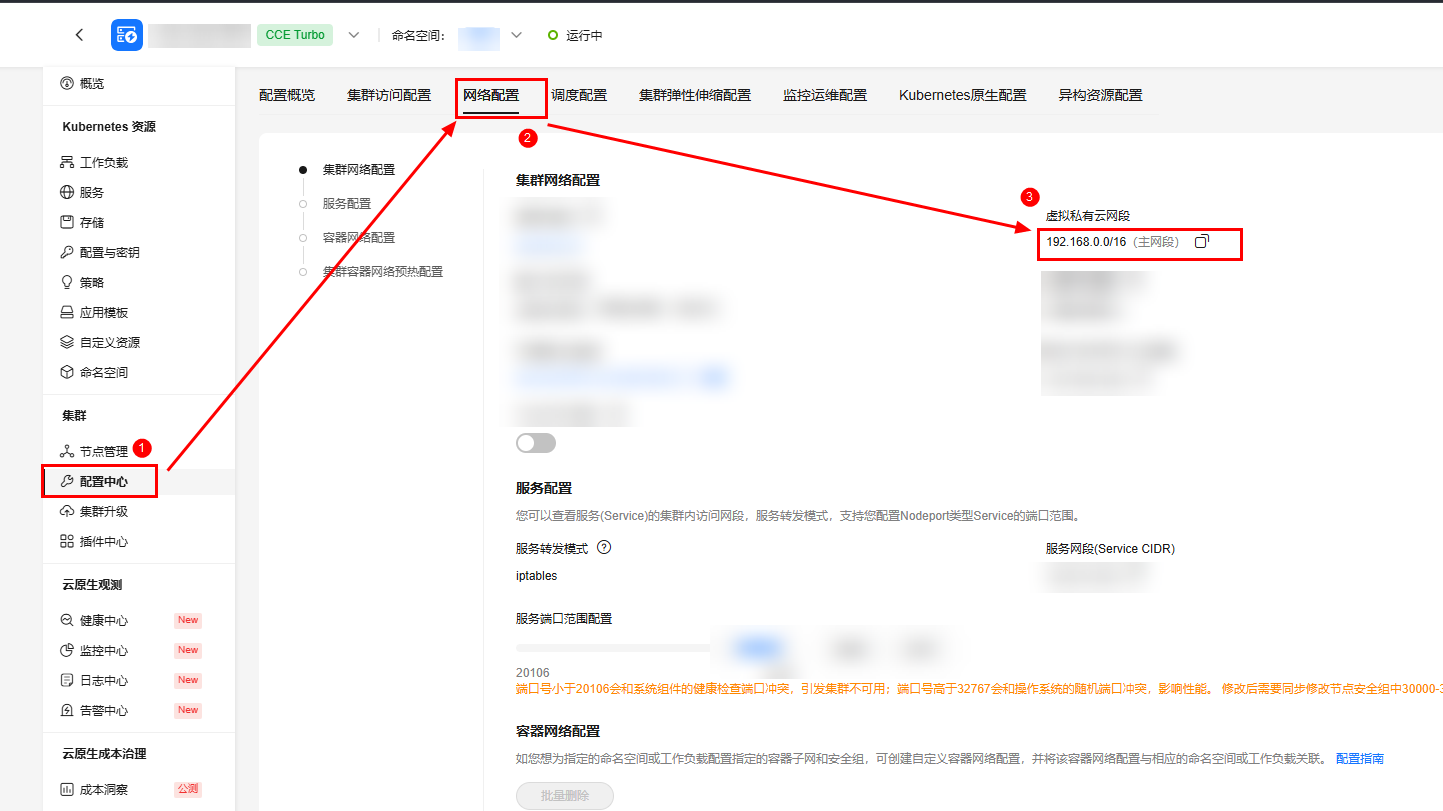 - 查询VPC网段。您可以在CCE管理页中单击,可以查看当前集群的VPC网段。