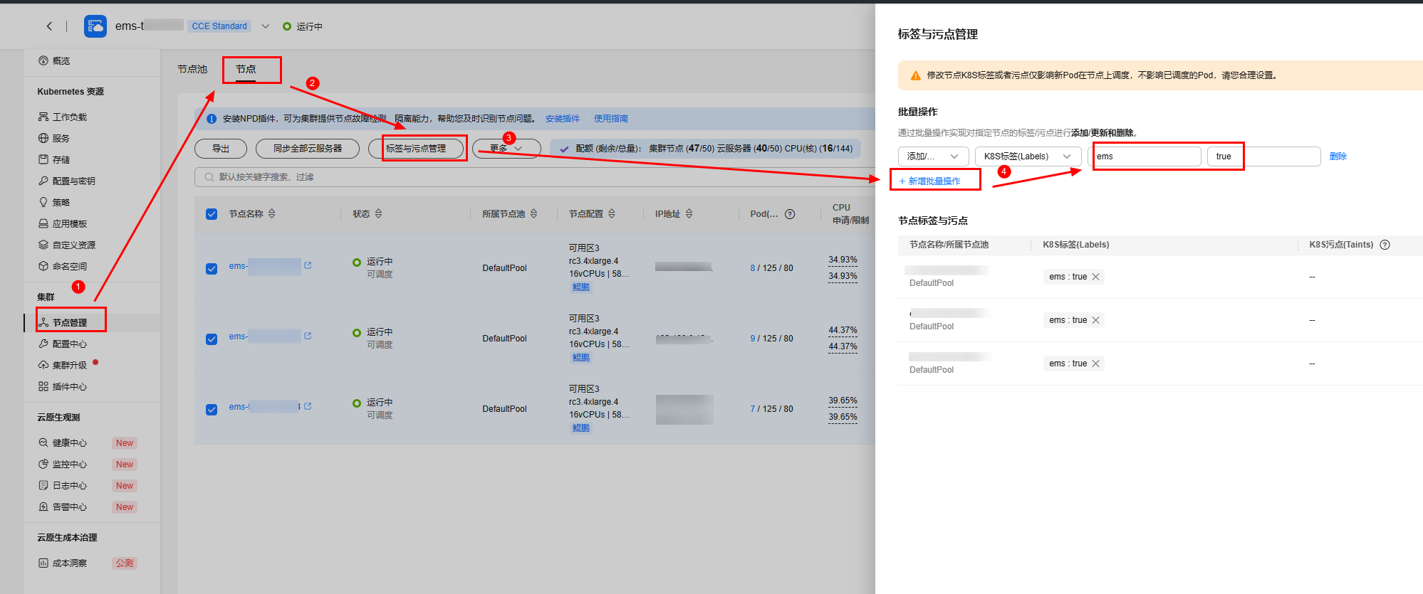 EMS会识别集群中打上“ems=true”标签的节点,并且只在这些节点上部署工作负载。通过增加和删除标签,可以实现工作负载扩容与缩容。