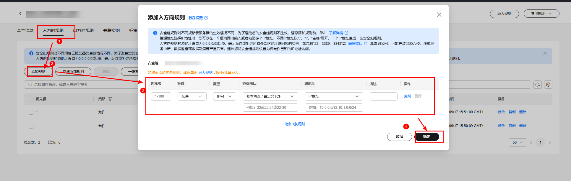 - 单击“添加规则”,按表1配置入方向安全组。其中VPC网段的值由1获取,默认容器子网安全组的值由2获取。