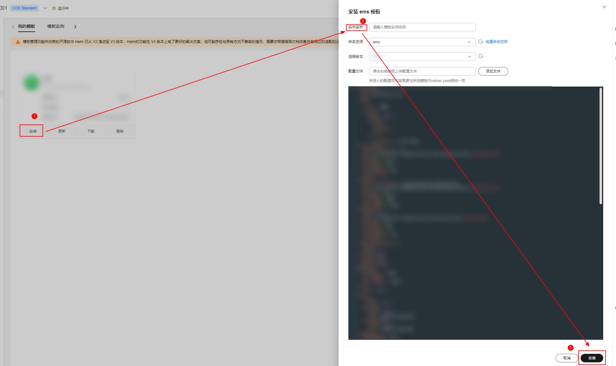 - 在CCE“应用模板”中的“我的模板”页面,单击“安装”,实例名称输入“ems-deploy”,命名空间选择“ems-meta”,配置文件参考表2中的检查项,确定配置正确后单击右下角“安装”按钮进行安装。等待安装完成。