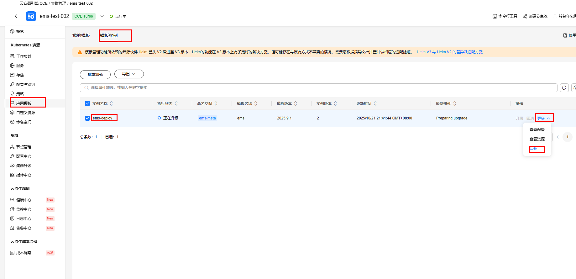 - 找到“ems-deploy”实例并单击操作列中的,等待卸载完成。
