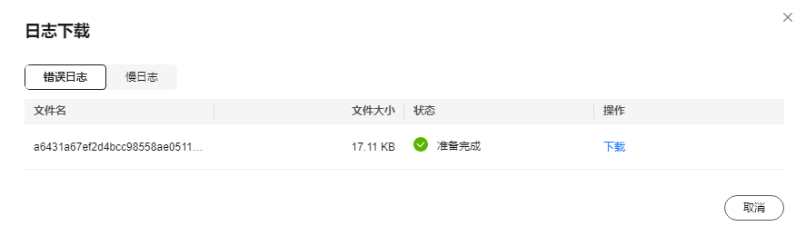 - 对状态为“准备完成”的日志文件,单击操作列中的“下载”,下载错误日志。