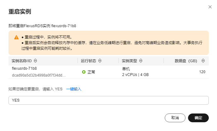 - 在“重启实例”弹框,输入“YES”,单击“确定”重启实例。