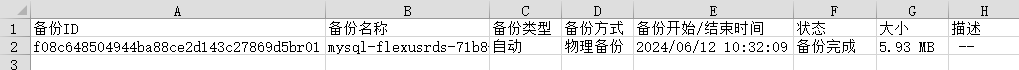 FlexusRDS for MySQL支持导出备份,用户可以通过导出备份功能将备份信息(备份ID、备份名称、备份类型、备份方式、备份开始/结束时间、状态、大小、描述)导出到Excel中,方便用户查看并分析备份信息。