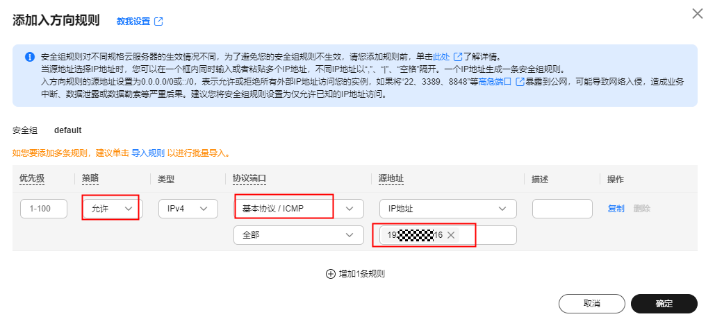 例如图1所示,函数的VPC网段为192.168.x.x/24,安全组的入方向需增加一个规则:“策略”选择“允许”、“协议端口”选择“ICMP”、“源地址”设置最小范围的网段为192.168.x.x/24。