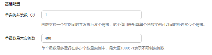 - 当前仅通过空白函数和函数模板创建的“HTTP函数”,以及通过容器镜像创建的函数支持“单实例并发数”参数配置,其他方式创建的函数无该配置参数。