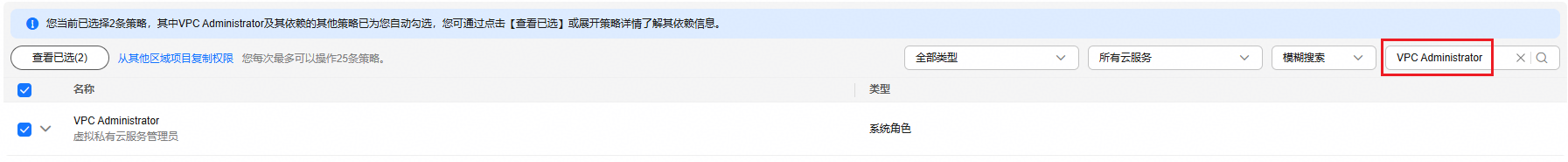 - 进入“选择策略”页面,如图6所示,在右方搜索框中搜索需要添加的权限并勾选,此处以添加VPC Administrator权限为例。勾选完成后单击“下一步”。