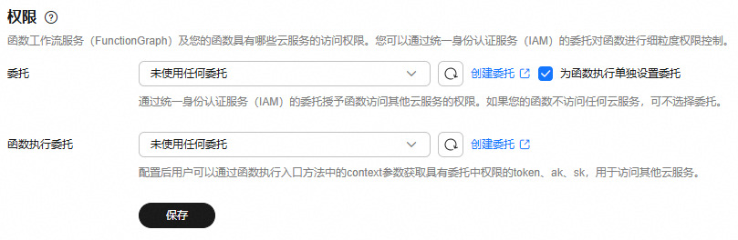 - 选择“设置 > 权限”,参考表3配置函数委托。配置完成后单击“保存”。