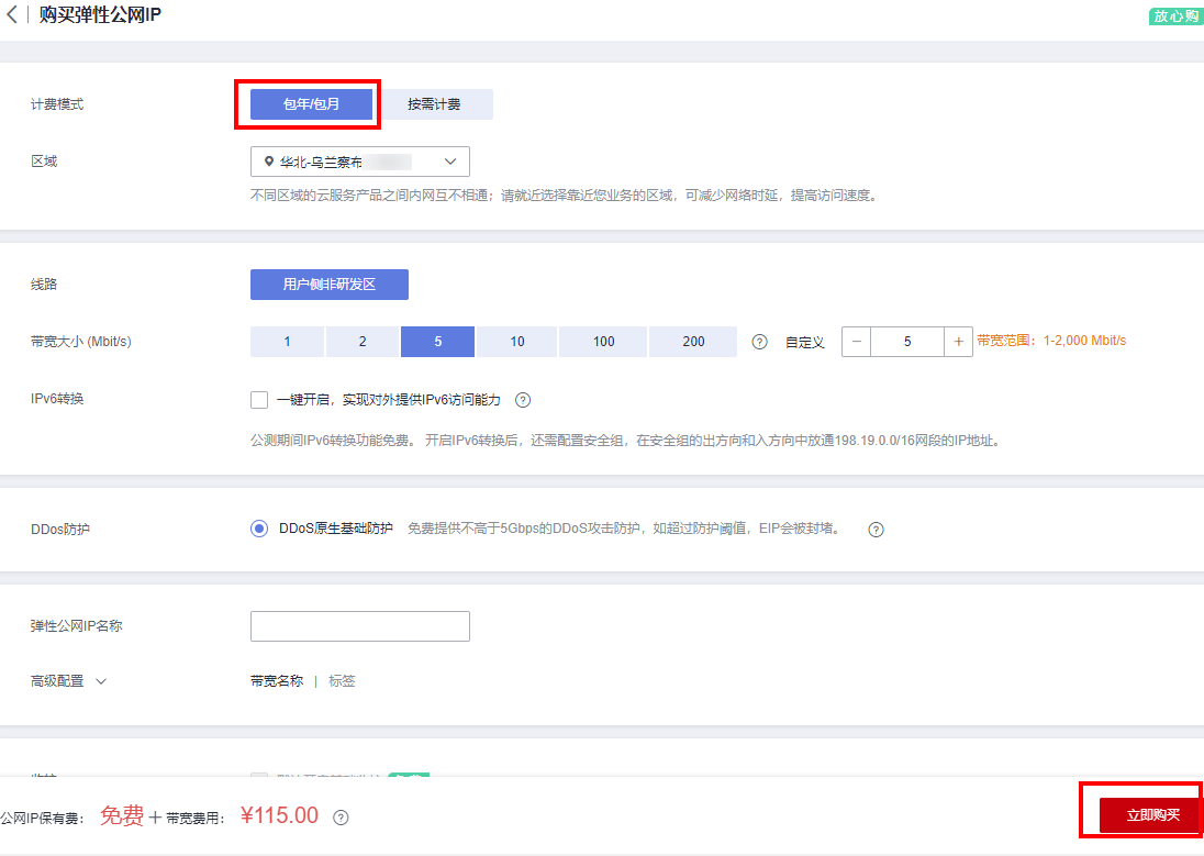 - 计费模式为包年/包月,根据界面提示配置其它参数。