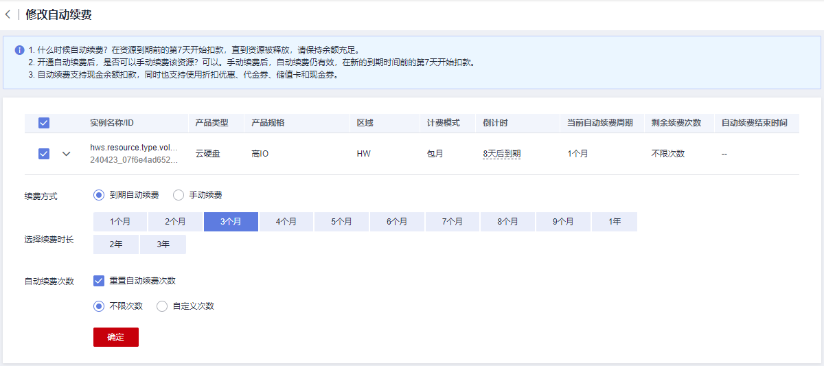 - “续费方式”默认为“到期自动续费”,可修改续费方式、续费时长和自动续费次数。