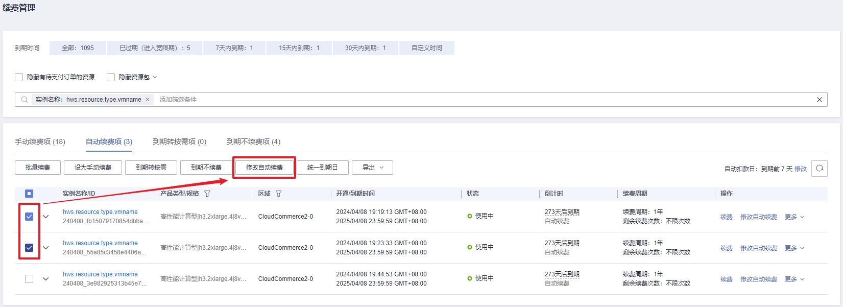 - 批量修改自动续费:在续费列表页面勾选需要修改自动续费的实例,单击列表左上角的“修改自动续费”。